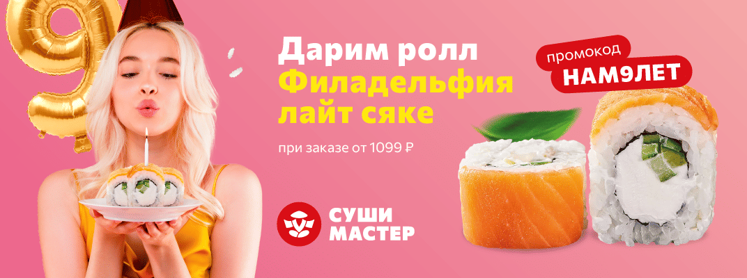 Дарим Филадельфию Лайт сяке к заказу от 1099 рублей.Промокод: НАМ9ЛЕТ (используйте его в момент оформления)